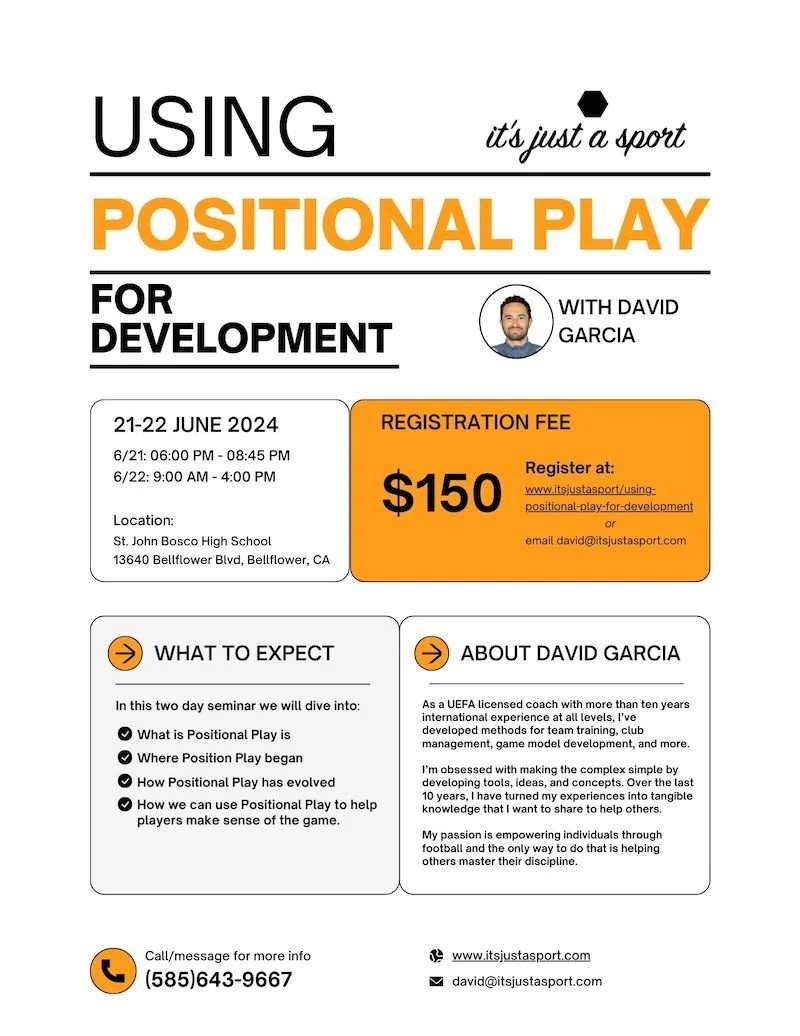 Using positional play for developmentTWO DAY SEMINAR | 21-22 JUNE 2024 | LOS ANGELES REGISTER NOW Using Positional Play for Development $150.00 Add to cart